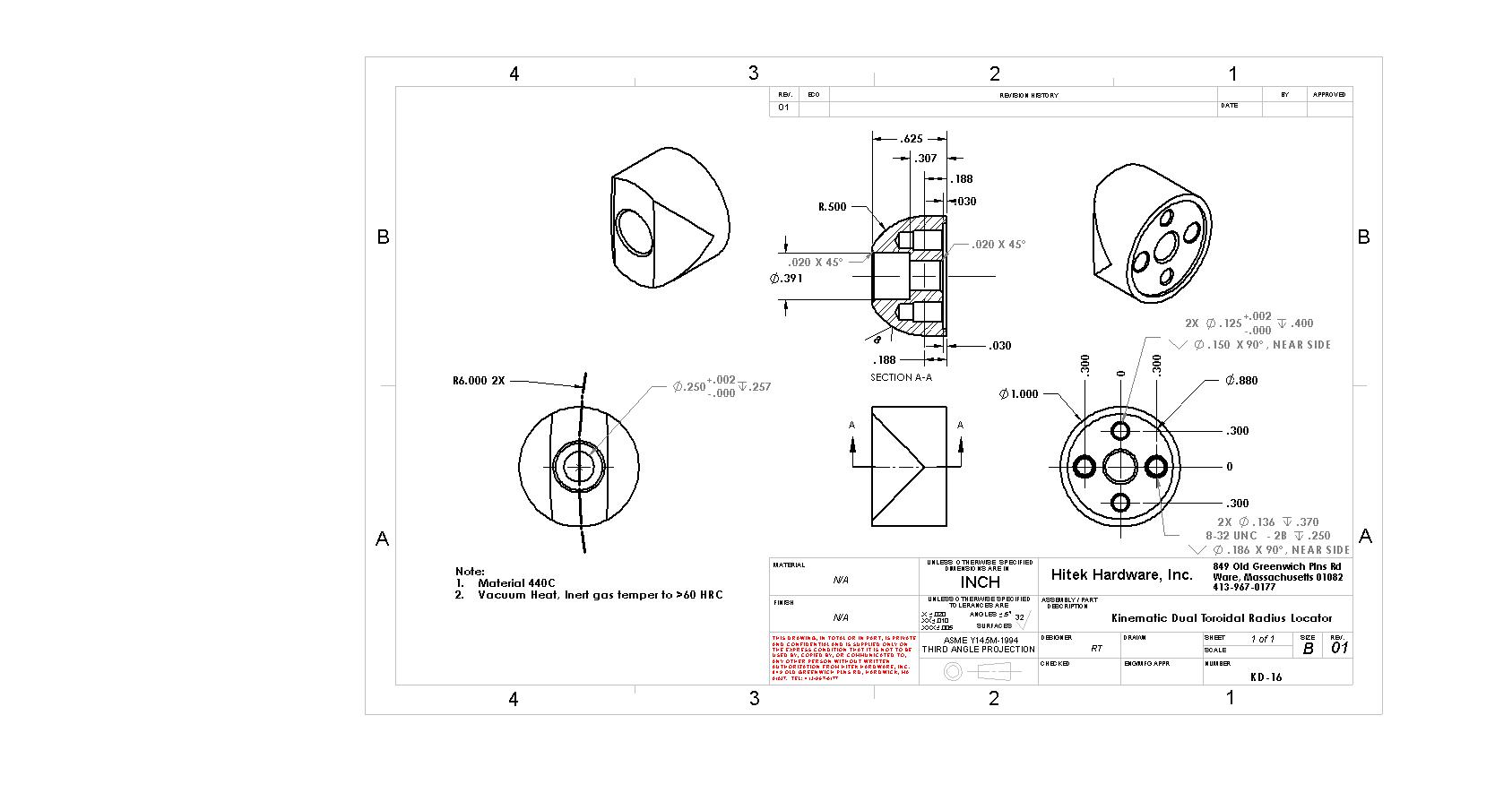 KD-16,is a double toroid kinematic component. This hardened 440C stainless steel component is designed to be used in place of a 1" diameter ball with Hitek's KS-16, KS-16-TS/174 kinematic Vee slot. This exchange will raise the load capacity of the pair by increasing the radius from 1/2 inch to 6 inches in the pointing direction of the Vee. The component can be secured through the top with a shoulder screw for central location with pins to align the vee, or from the bottom with screws and pins. The component can be special ordered in 17-4PH-H900 or in A-2 HRC62 tool steel.